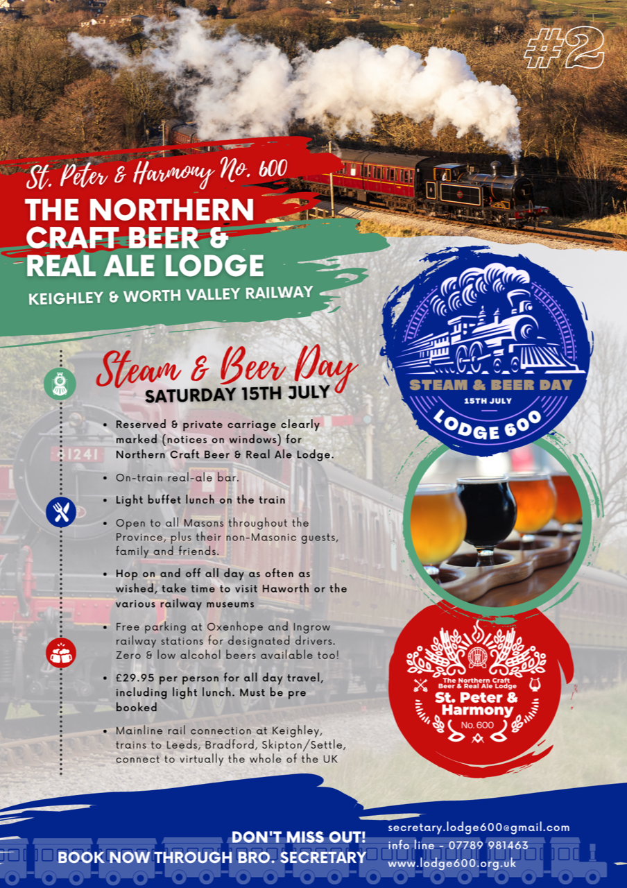 The annual Masonic Steam and Beer event hosted by St Peter & Harmony 600, the Northern Real Ale & Craft Beer Lodge, will take place on Saturday 15th July 2023, on the Keighley and Worth Valley Railway. We have a privat bar carriage and two further private carriages, with real draft beer on the steam train as well as a light buffet lunch.  It’s accessible via mainline public rail transport, at Keighley – connections from Leeds to most of the country.